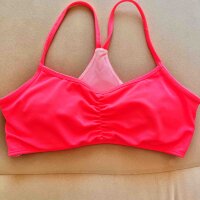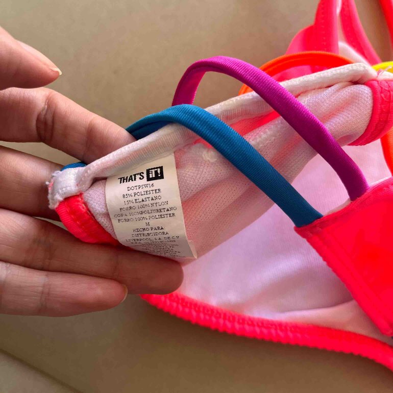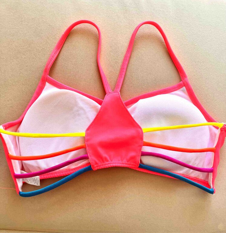 Top de traje de baño rosa fosforescente con copas y tiras de colores en la espalda