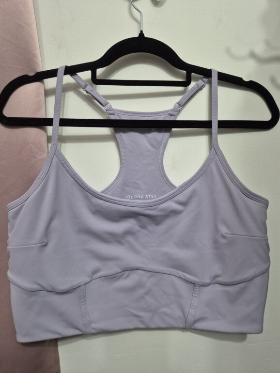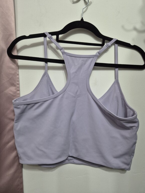 Top deportivo color lila, soporte medio y diseño racerback. Tela elástica y cómoda, ideal para yoga, pilates o gimnasio. Ajuste favorecedor, transpirable y versátil para entrenar con estilo.