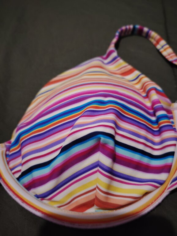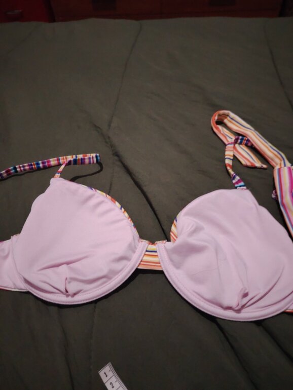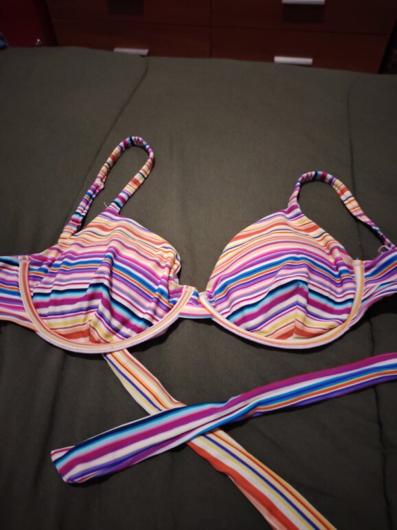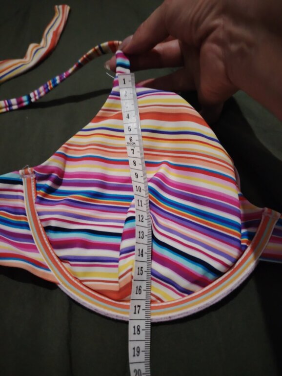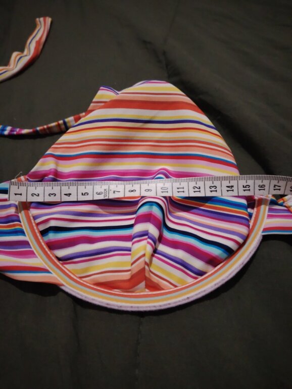 Top de bikini con varilla, talla estimada M/L. Las tiras que se amarran en la espalda miden aprox. 50 cm cada una. El ancho se la copa mide 16 cm y 17 cm de altura (del tirante para abajo. Equivale a 36B–36C. Copas formadas sin push-up, diseño multicolor y muy buen soporte.