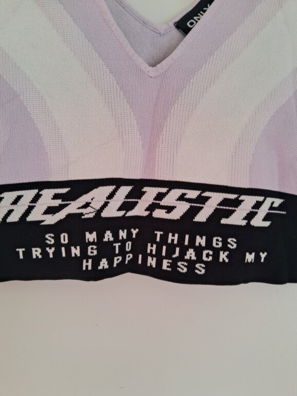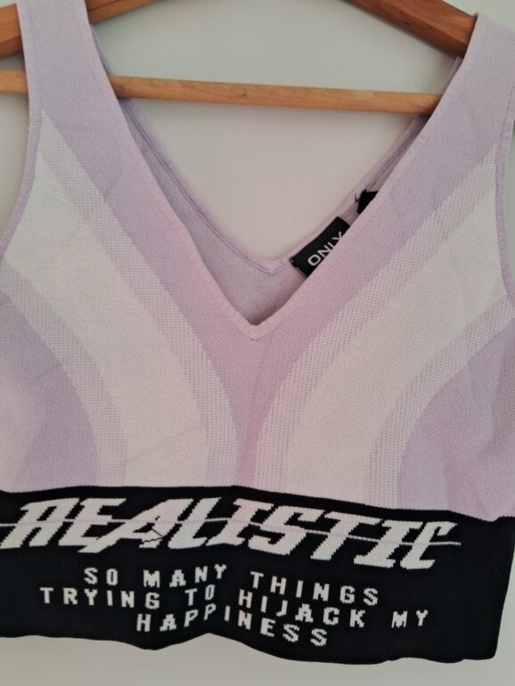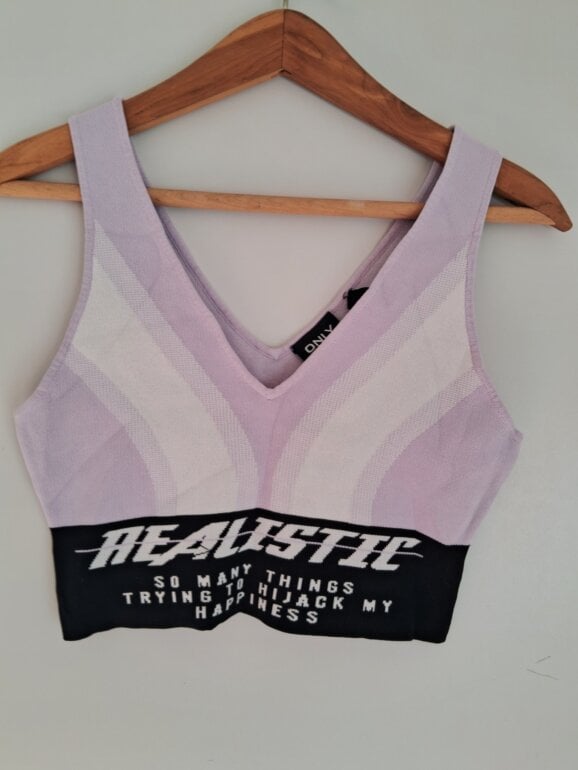 Top deportivo marca ONLY EDGE LUXURY TALLA M. Color lila, blanco y negro. Tela gruesa resistente. Leyenda Realistic.