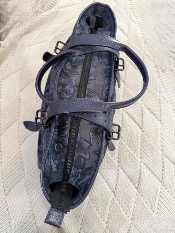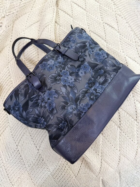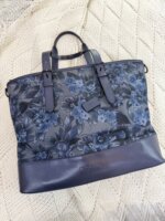 En piel y tela, color azul marino y flores