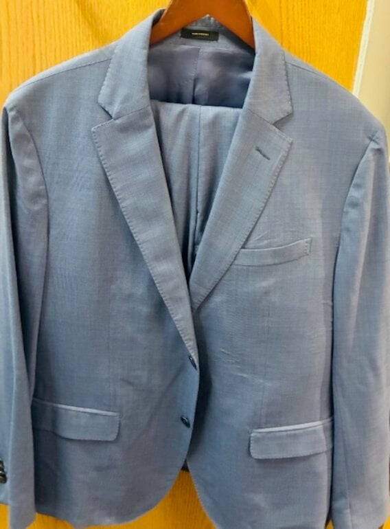 Traje dos piezas, tela minicuadros tono azul grisáceo. Marca espanola Massimo Dutti. Talla saco 40, talla pantalón 38 mexicano. Lana extrafina. En perfecto estado. Está ajustado para hombre de 95 kg y 1.80 de altura.