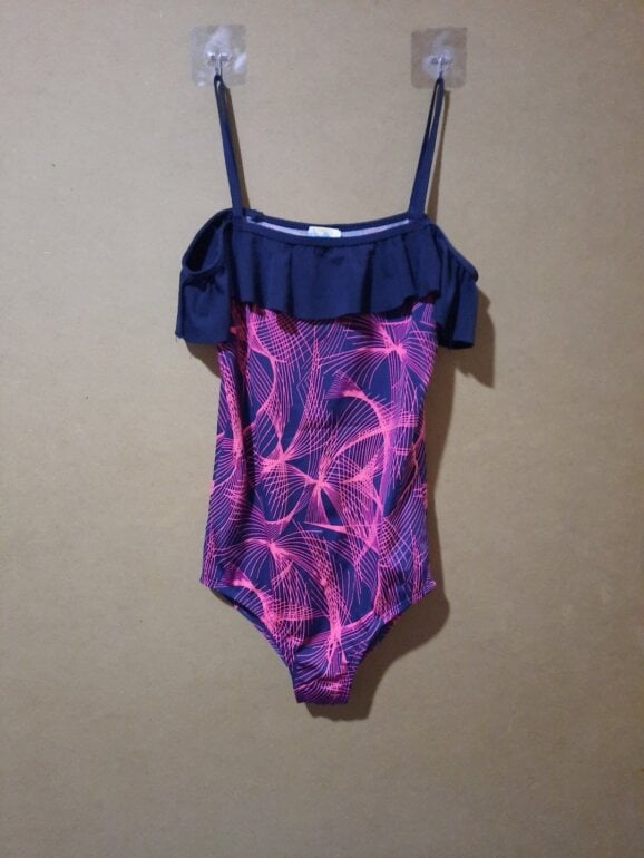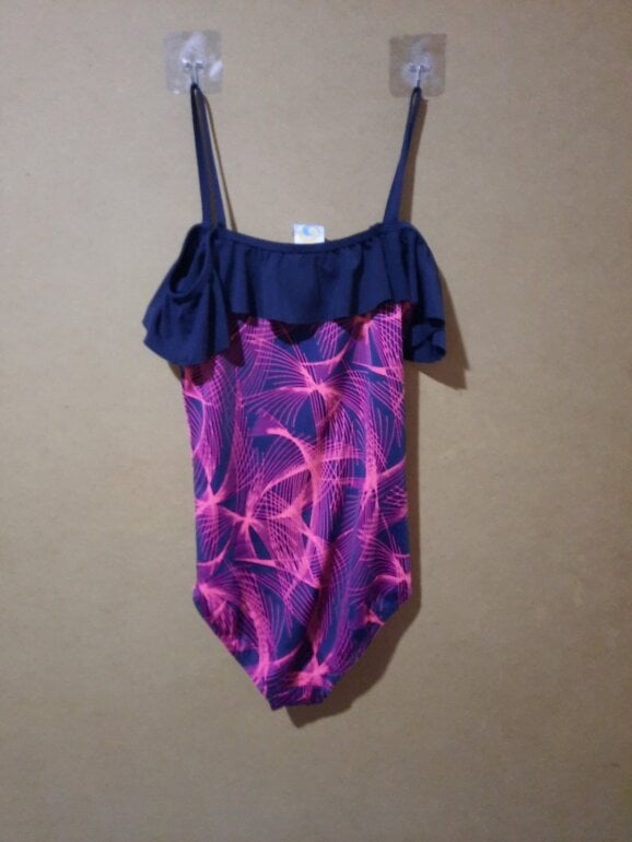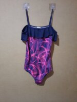 Traje de baño completo para niña talla 14 azul marino con rosado de tirantes con olanes.