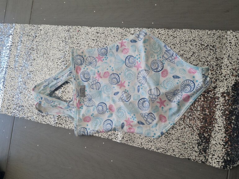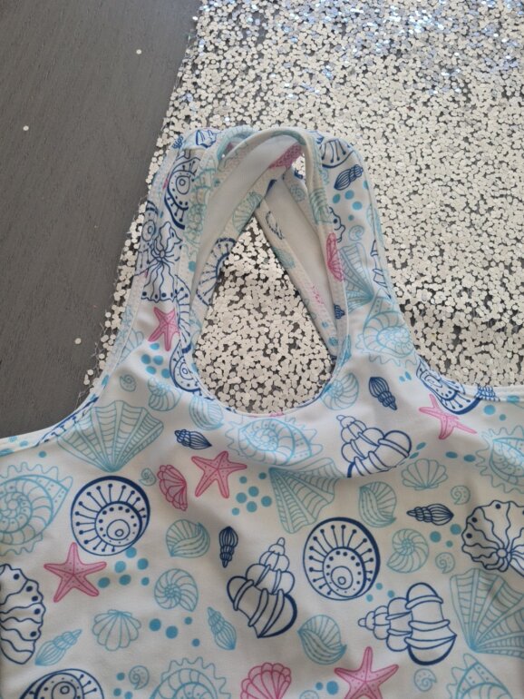 Traje de baño niña blanco con dibujos de caracoles y estrellitas de mar usado una vez