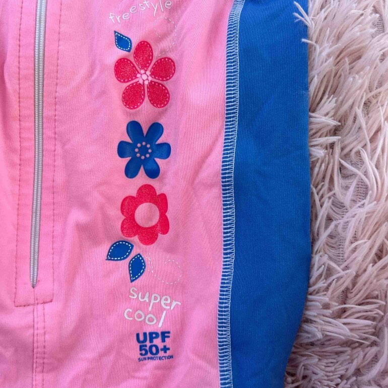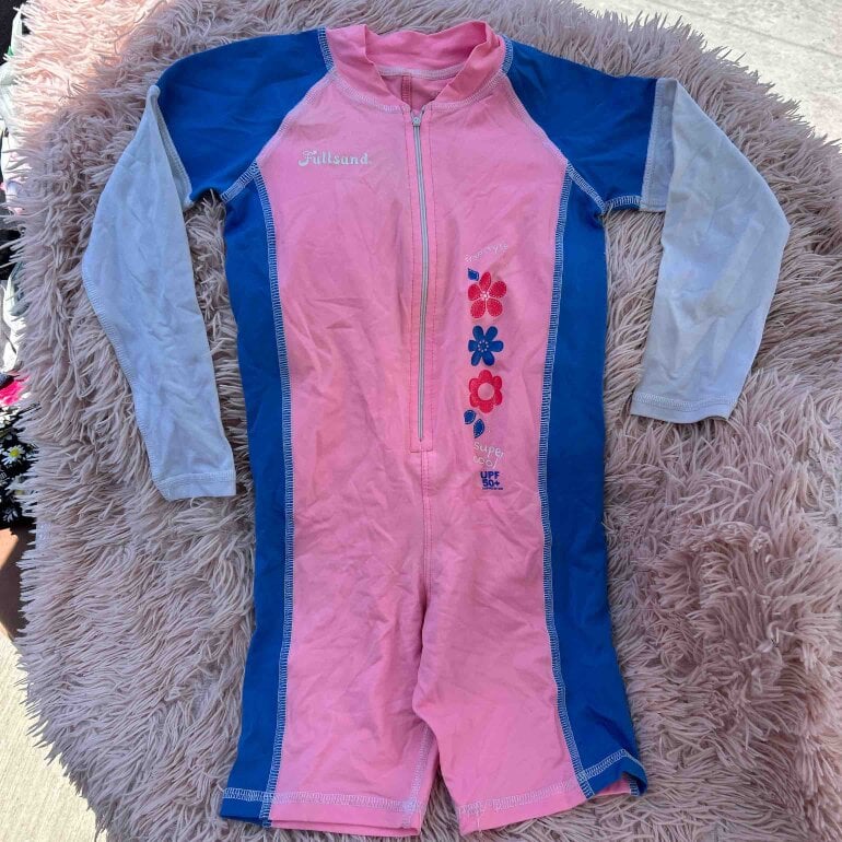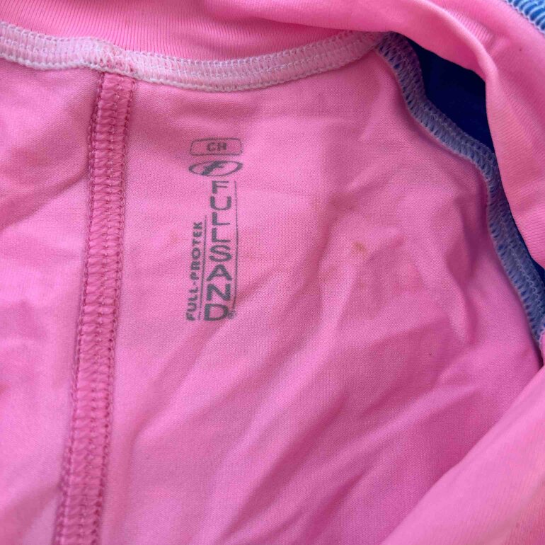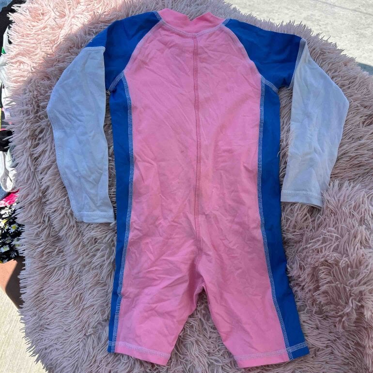🥰 hermoso, traje de baño, talla chica, color rosa con azul y blanco marca full sand Fa protección solar 50+ , , circunferencia de pecho, 32 cm, de hombro a largo de pierna 61 cm