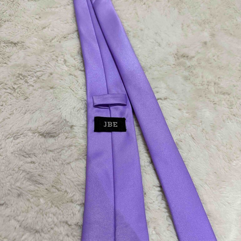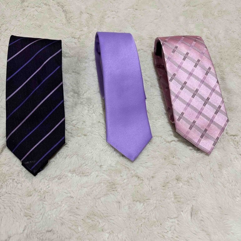 Paquete de tres corbatas de distintas marcas: la rosa es Joe, la lila JBE y la morada Clásicos Suburbia