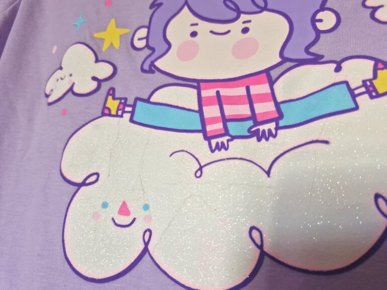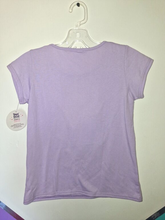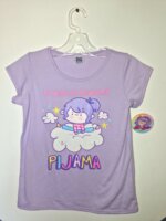 Conjunto de pijama para niña de 2 piezas. La playera morada de manga corta, con estampado en brillos y texturas. [Una parte del estampado cuenta con unas pequeñas grietas por defecto de un mal doblado]