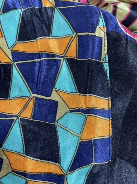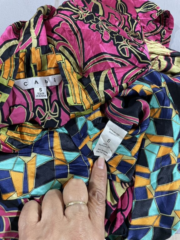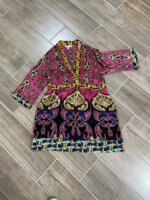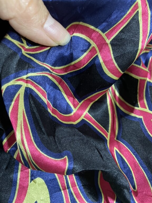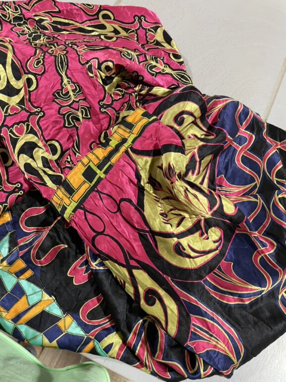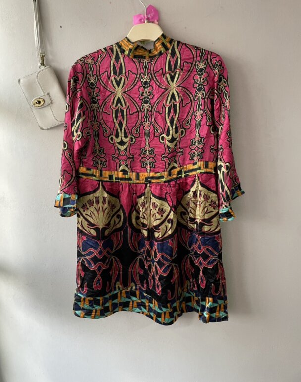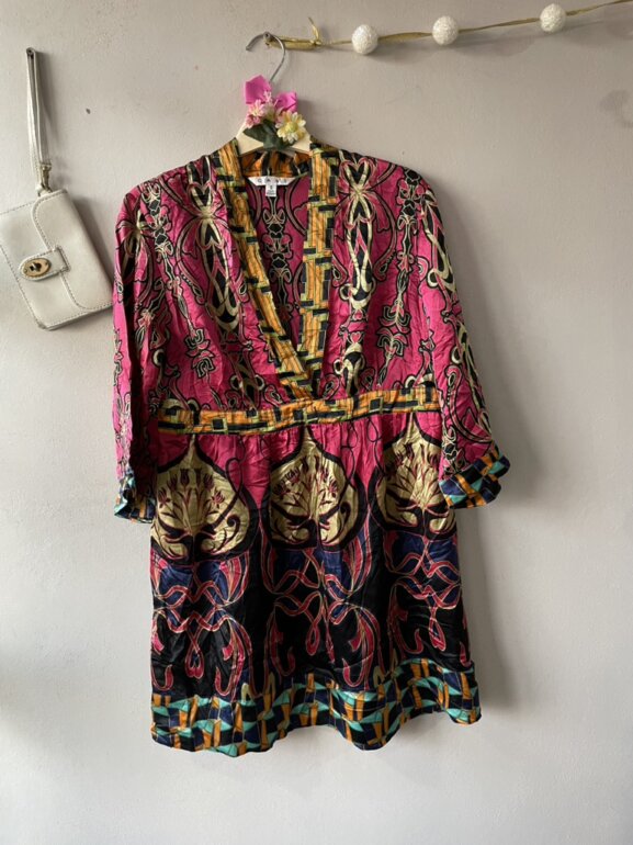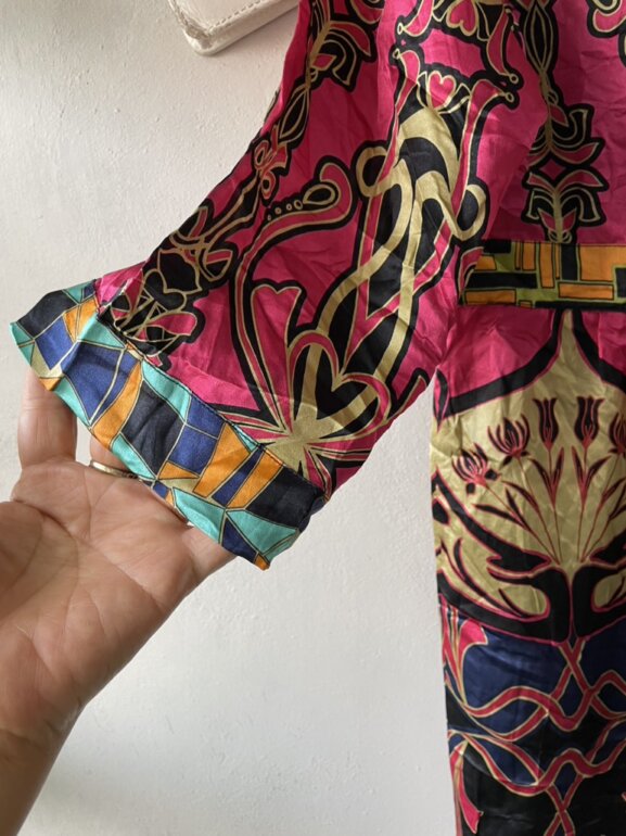 Bellísimo! Colorido hermoso y rica tela seda 100% y un lindo diseño túnica manguita 3/4, no tengo las cintas para ajustar la cintura es talla S tiene cuello V y la tela no estira