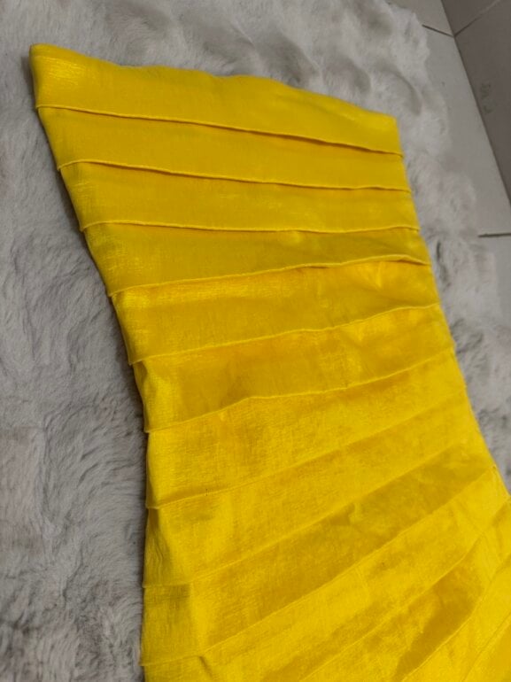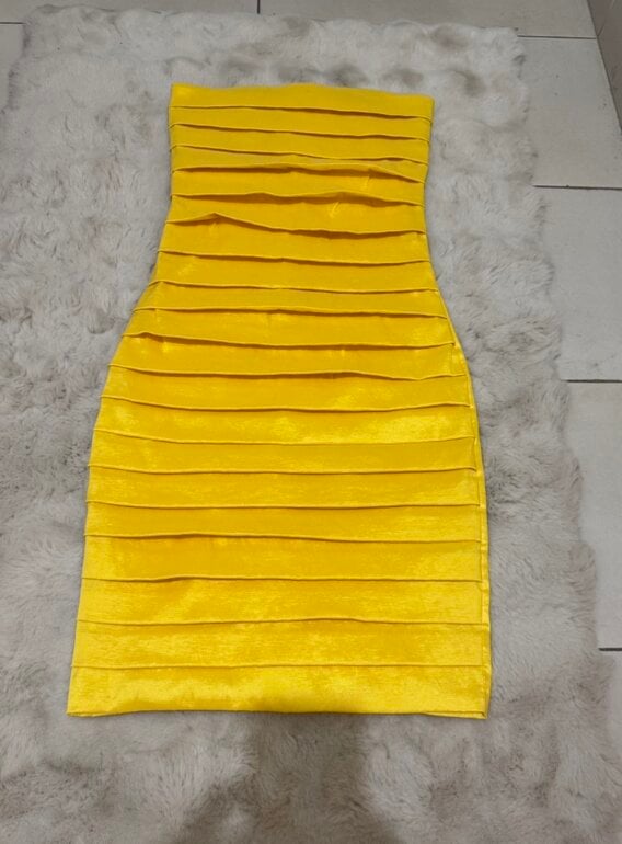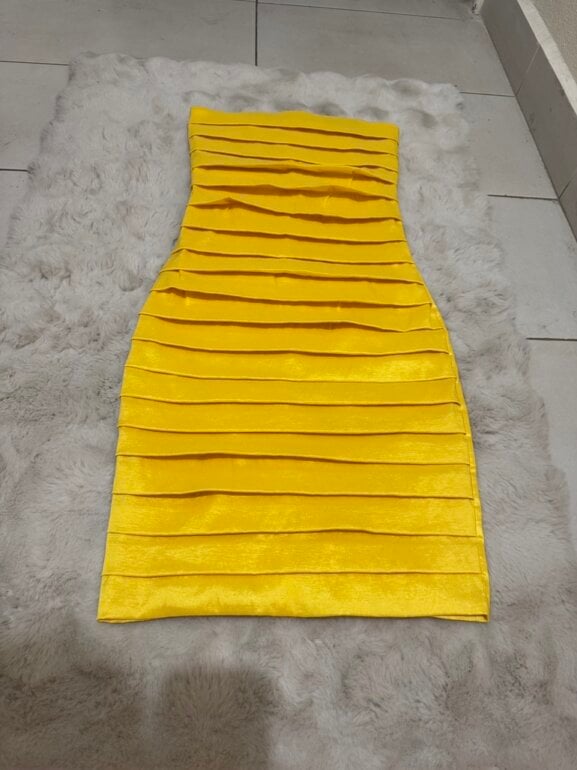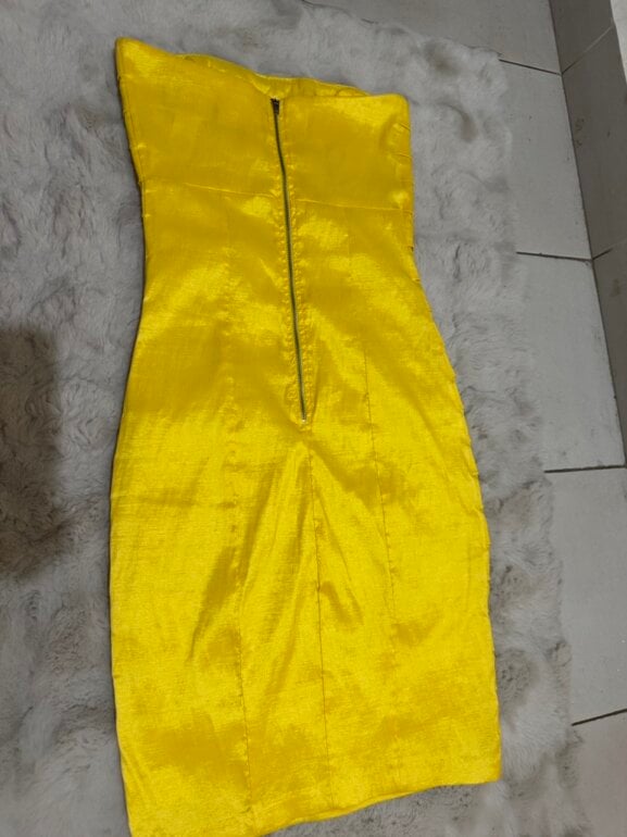 Hermoso vestido amarillo de tela brillosita. Strapless. La tela estira y amolda al cuerpo haciendo lucir una silueta increíble. Sólo lo usé una vez. No tiene detalles.