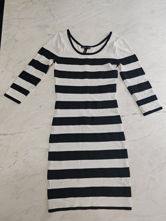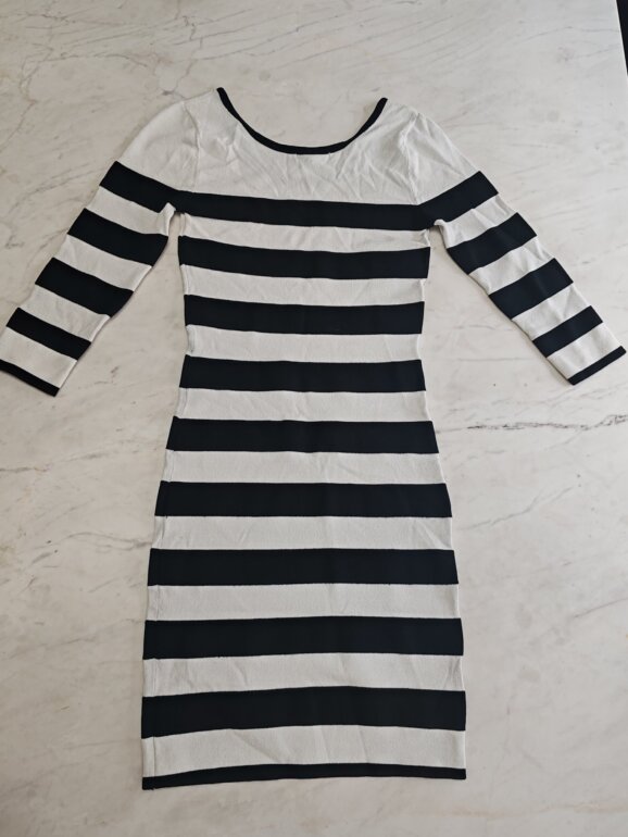 Vestido básico con rayas blancas y negras. La tela es gruesa y se ajusta bien al cuerpo. La manga es largo 3/4. Se encuentra en perfectas condiciones. Largo 85 cm