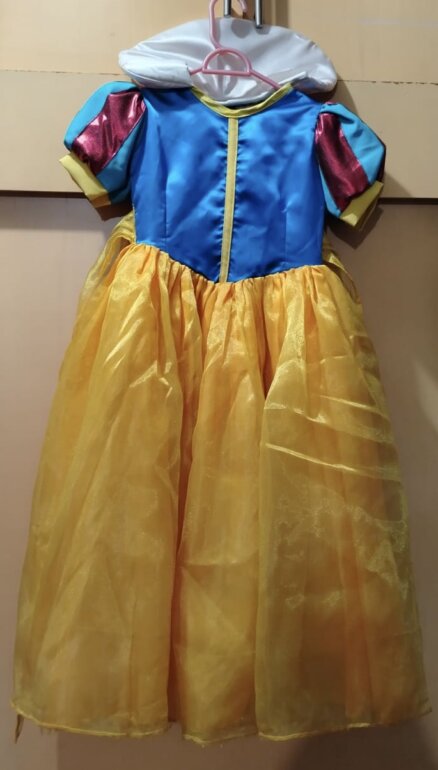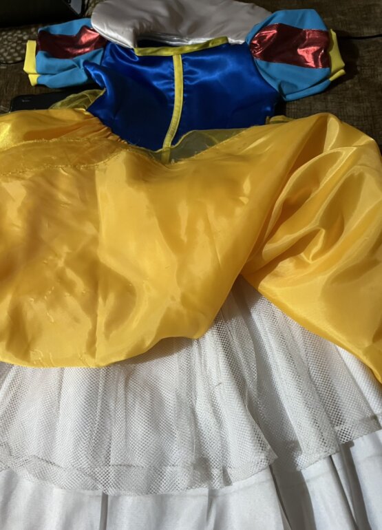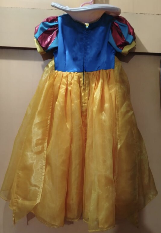 Vestido de Blanca Nieves usado una sola vez. La tela es de buena calidad, trae forro y crinolina. Trae Velcro en el cuello para acomodar el cuello y 2 broches para poner la capa. Tiene un listón largo para hacer un moño y ajustar.