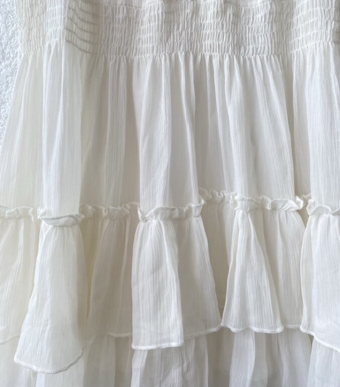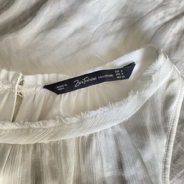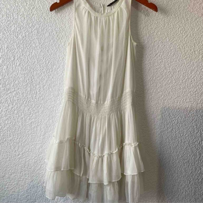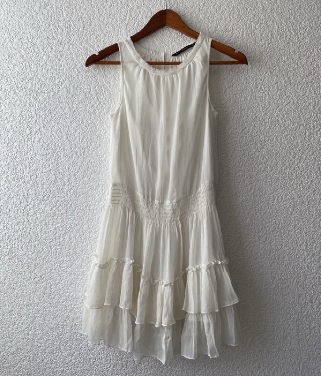 Vestido blanco (un poco color hueso) corto con olanes. Muy bonito para eventos en la mañana y muy fresco. Zara talla S en buenas condiciones 🤍