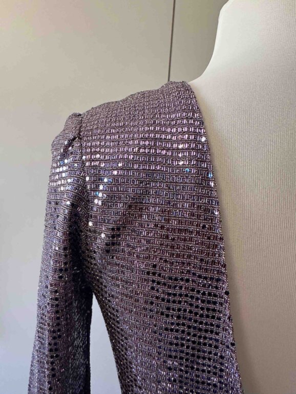 Viene marcado como unitalla pero yo recomendaría más para una talla S o M, es súper bonito ya que cuenta con un escote en la espalda y tiene un brillo precioso, es de un color morado claro o lila, sin ningún detalle y tiene fondo por lo que no transparenta nada. El color es un morado intermedio, se aprecia mejor en la última imagen. 💖