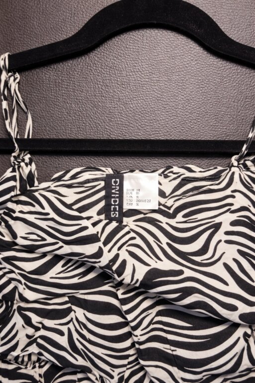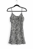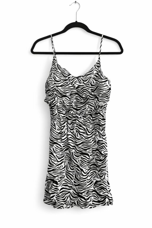 Vestido original H&M , con estampado animal print tipo cebra en blanco y negro. Diseño con tirantes delgados y escote fruncido que realza la figura, además de detalle de olan en la parte inferior que aporta movimiento y estilo.
