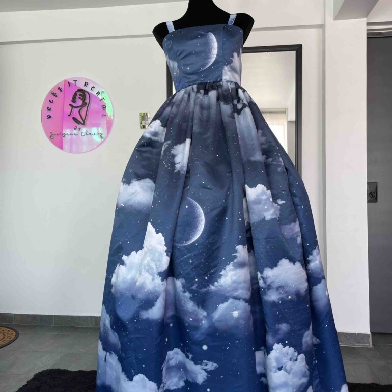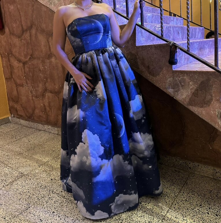 Hermoso vestido cielo de la diseñadora Georgina Chávez tiene bolsillos, tirantes removibles y cintillas
