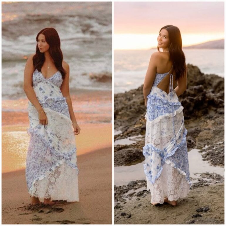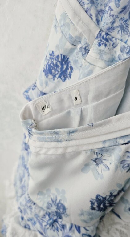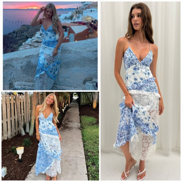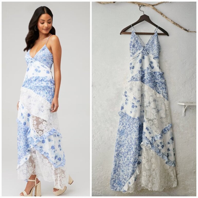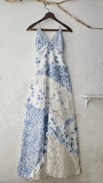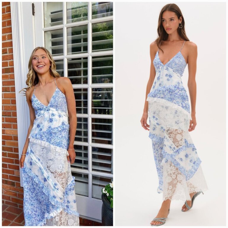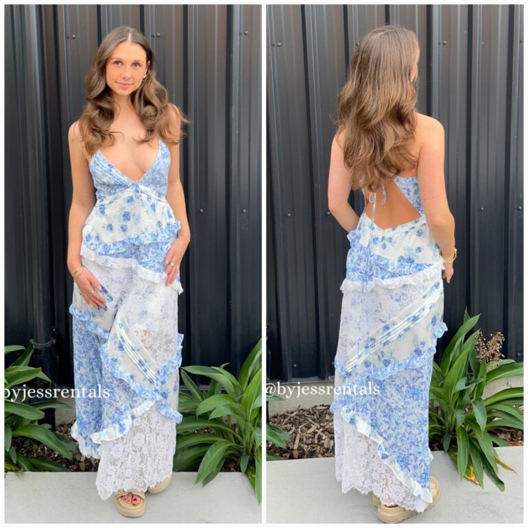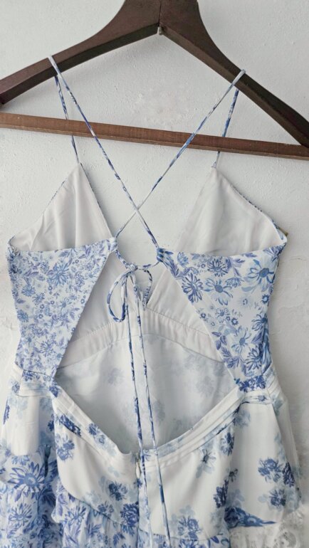 Vestido muy viral en el diseño Rosalyn de For Love & Lemons en tono azul y blanco. Un vestido muy romántico con toque de diferentes texturas, tiene encaje blanco y diseño floral sobre tela azul con olanes. Escote en V con tirantes spaghetti ajustables que se cruzan por detrás en el escote. No trae la talla por que tiene la etiqueta recortada pero queda a ch. Precio en linea: $315 dólares
