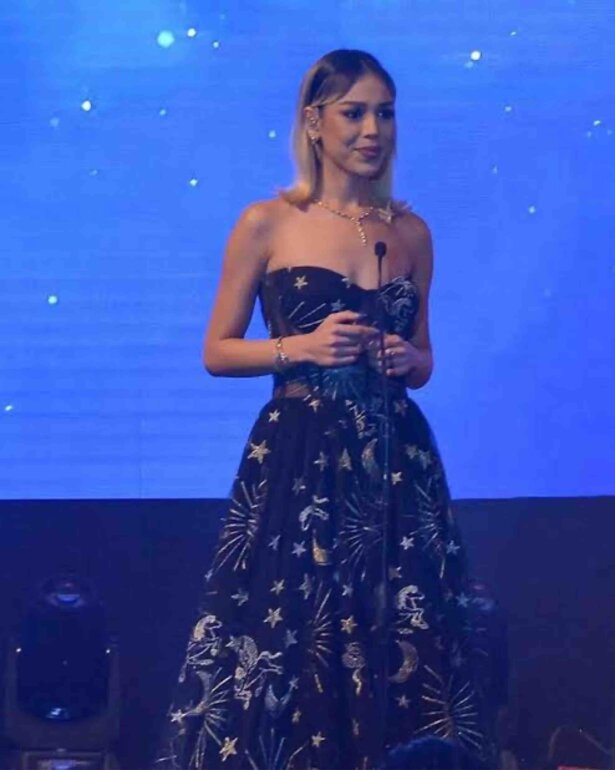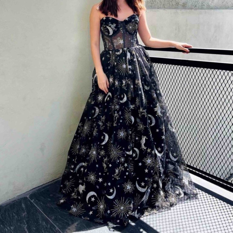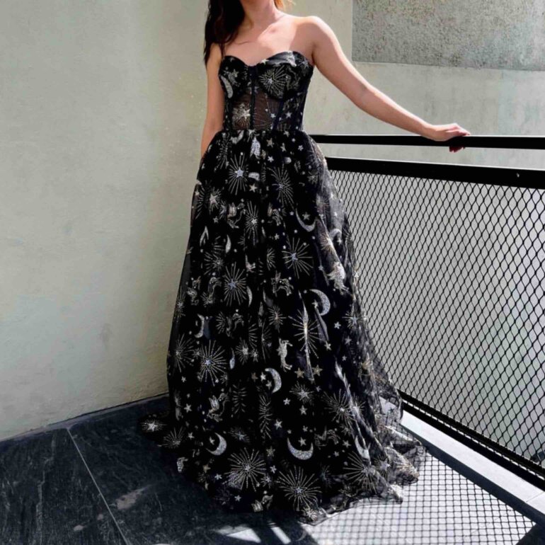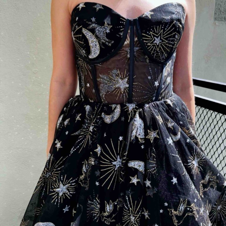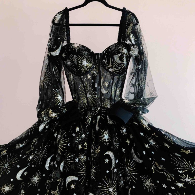 Discover the Constellation Dress, a magical piece that unites elegance and astral charm in a dazzling design. This dress is made from glitter tulle. It features a gold and silver constellation print, evoking the night sky. The mix of materials includes illusion tulle, charmeuse and a soft lining. This ensures comfort and style with every move.