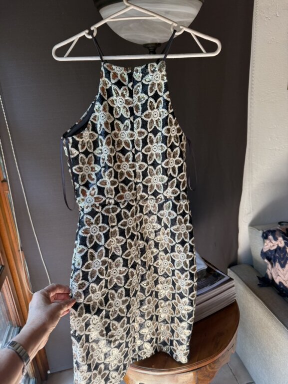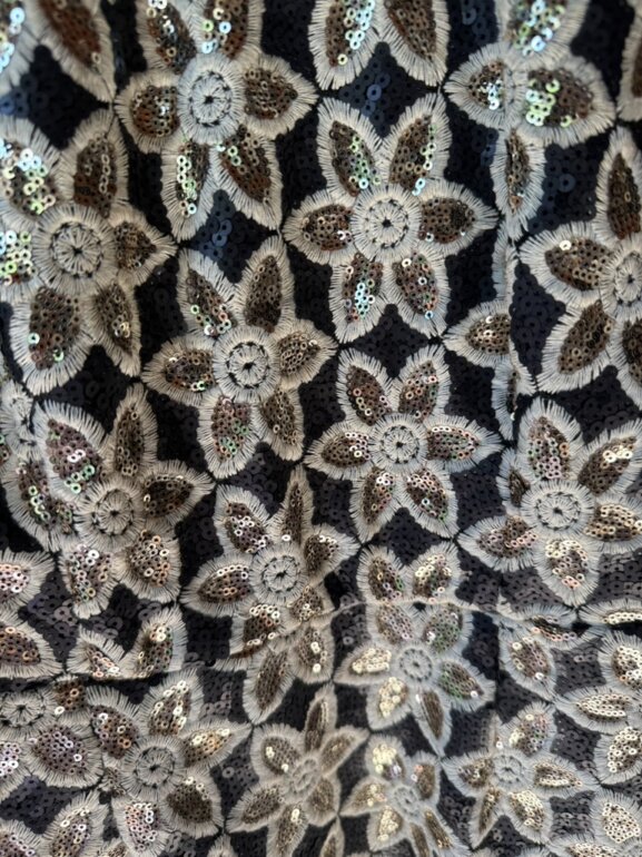 Precioso vestido con fondo negro de lentejuelas pequeñas y bordado en beige con lentejuelas doradas en el centro