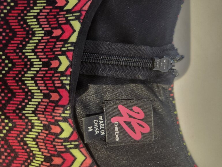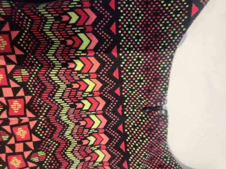 Vestido corto sin mangas con diseño ajustado que realza la silueta. Presenta un llamativo estampado geométrico multicolor sobre fondo negro, ideal para un look moderno y juvenil. Cuenta con escote redondeado y cierre con cremallera en la parte trasera para un mejor ajuste. Confeccionado en tela suave y cómoda, perfecto para salidas casuales, fiestas o eventos informales.