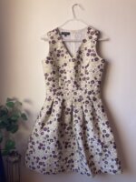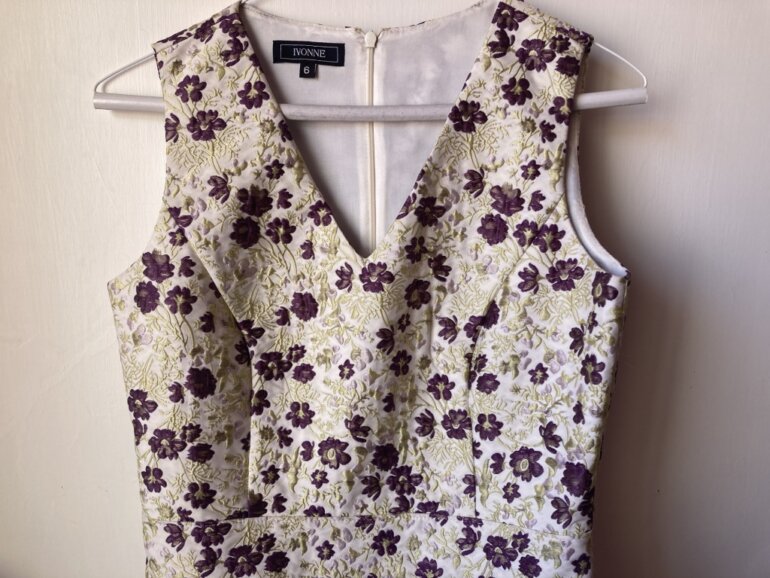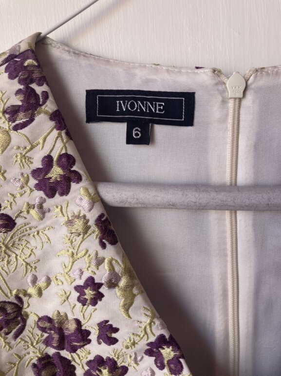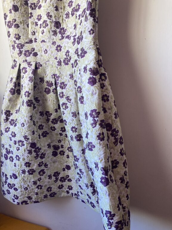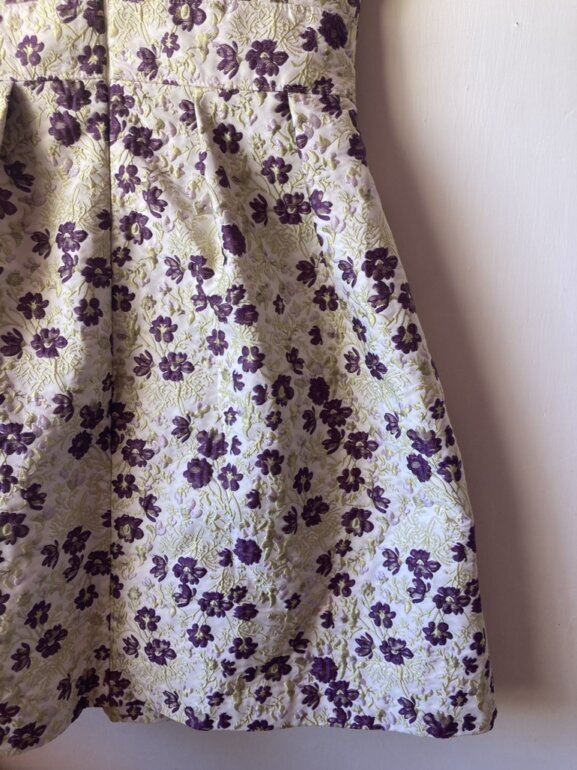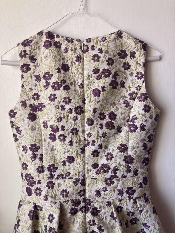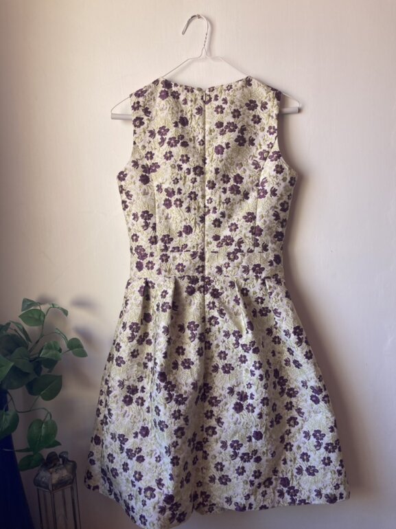 Vestido Ivonne de cocktail o eventos en jacquard floral en violeta y verde claro, corto, talla 6 petite (XS), nuevo sin etiqueta, con forro, sin mangas, escote en V.