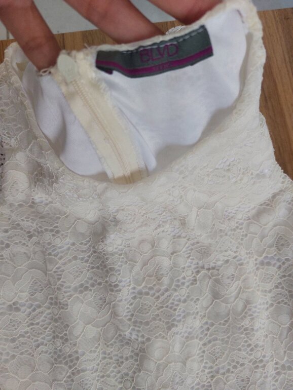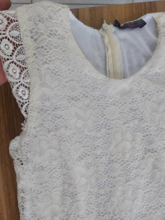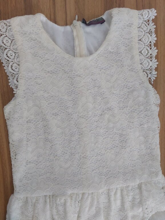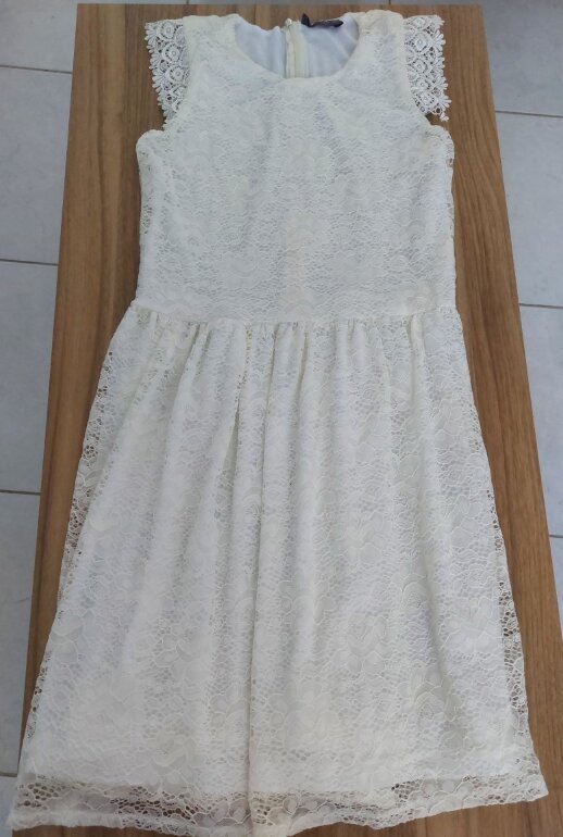 Vestido fresco de encaje color beige con forro blanco, tiene cierre en la parte de atras, sin mangas. Excelente estado