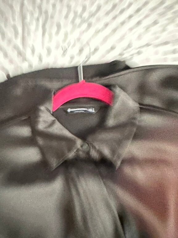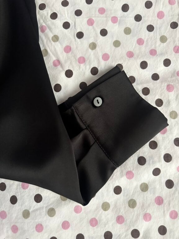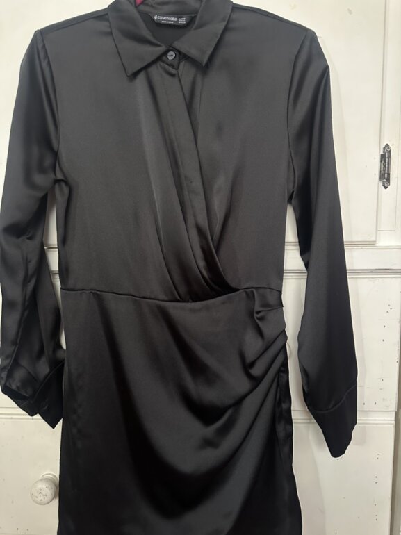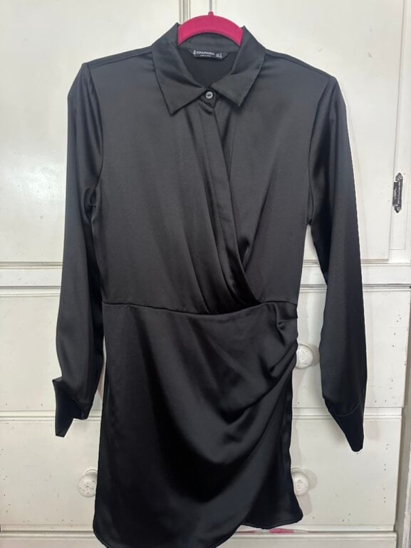 Vestido de fiesta marca Stradivarius. Color negro, tela satinada, con cuello camisero, manga larga, detalle en cintura, largo a la rodilla. Talla S. Excelente estado