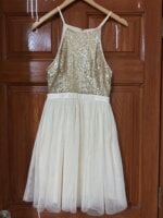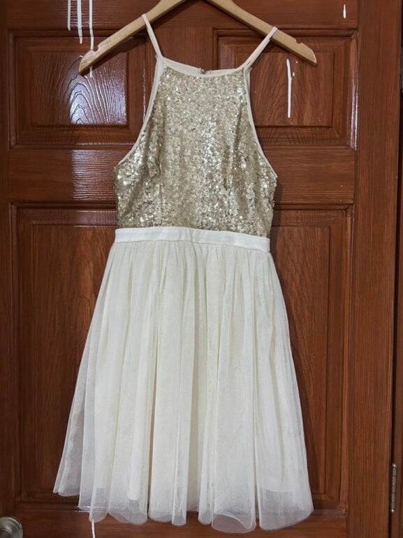 Vestido corto color crema con parte superior de lentejuelas doradas y falda de tul. Diseño delicado y elegante, ideal para fiestas, graduaciones, eventos especiales o cenas formales. Súper cómodo y ligero.