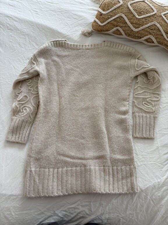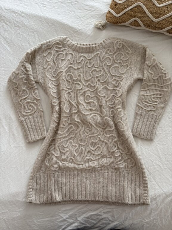 Vestido de punto corto, maga larga y diseño de tejido hermoso. Cuello redondo. Muy poco uso. Lo vendo por limpieza de clóset. Marca mayoral. Talla 16 años pero da a una chica de dama. Yo mido 158cm y de lo largo me queda cómodo.