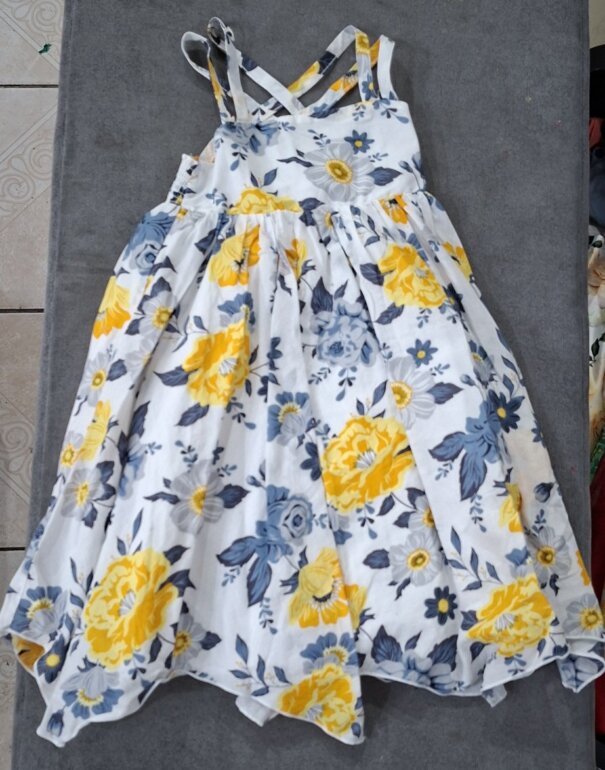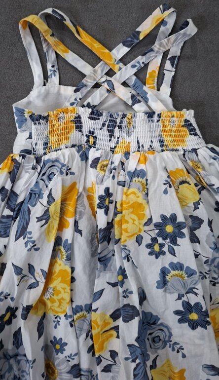 Bonito vestido con tirantes cruzados en la espalda,estampado de flores azules y amarillas. Es super fresco,de la parte de abajo es asimétrico. Sin detalles. Talla 2-3 años