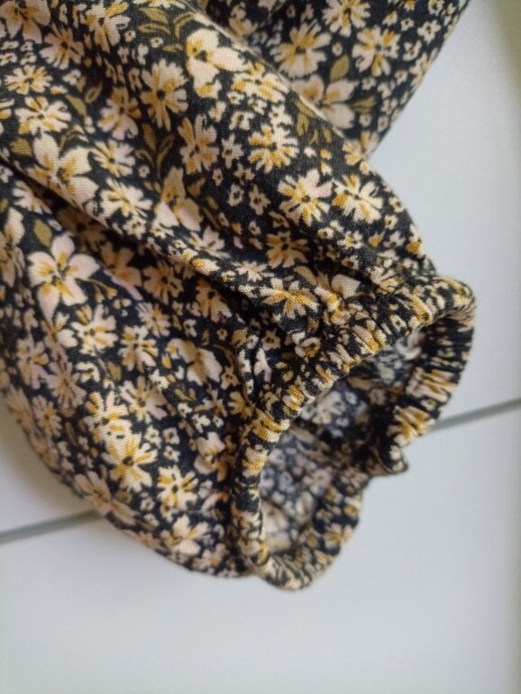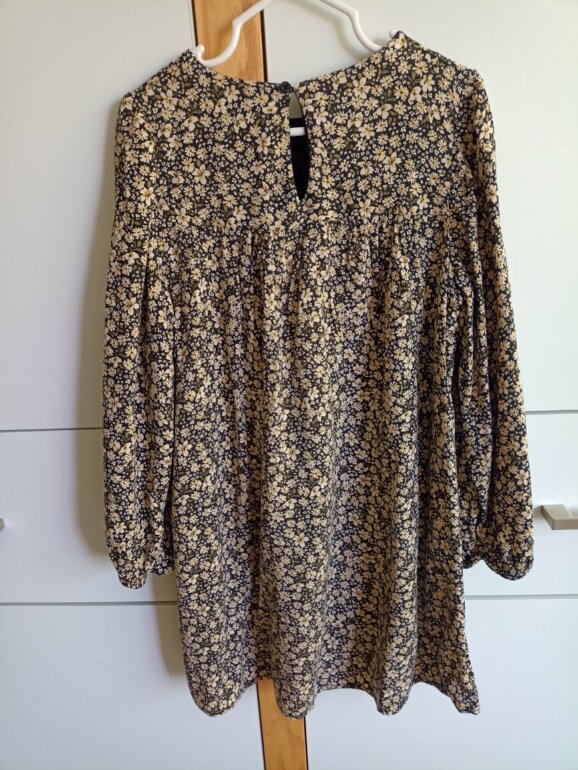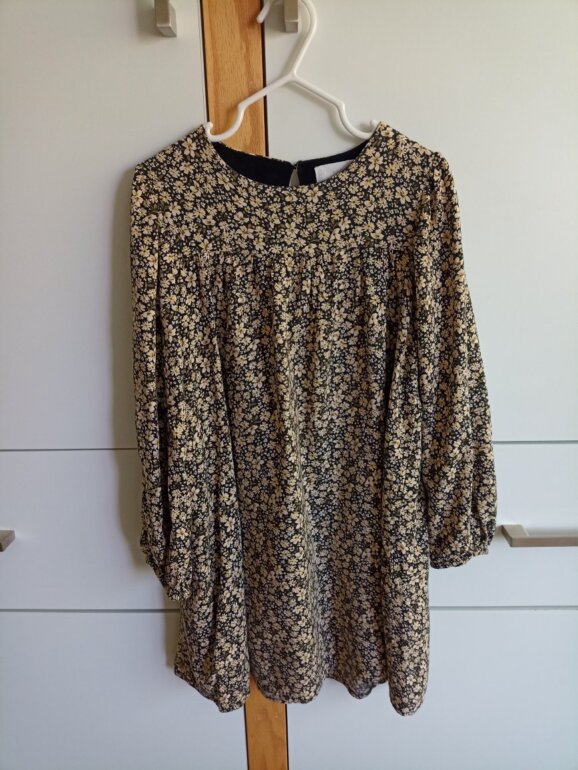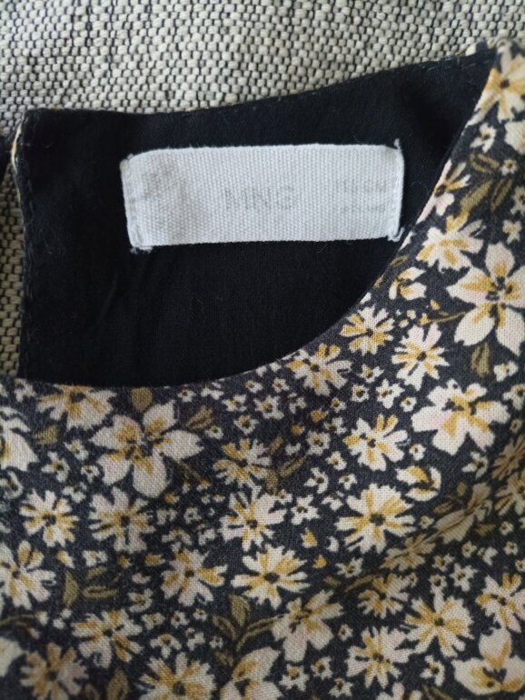 Vestido estampado floral, niña talla MX 116 cm/6años- MNG /algodón / color negro y dorado, largo a rodilla.