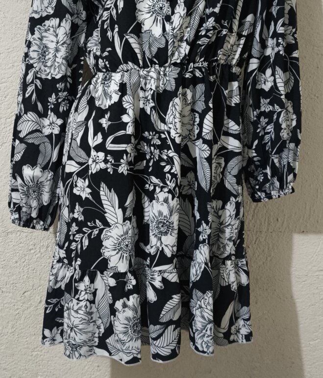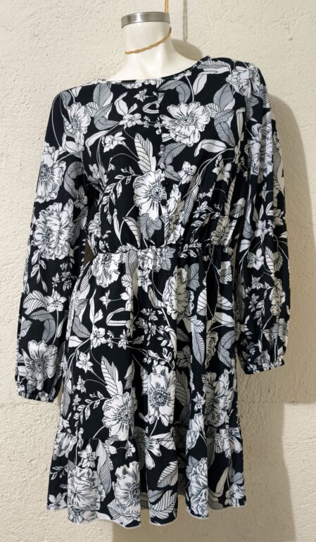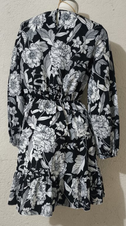 Vestido corto negro con blanco y diseño floral, súper femenino y versátil. En perfectas condiciones poco uso sin daños ni manchas.