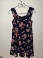 Vestido corto color azul marino, estampado floreado, talla M, los tirantes van en el hombro tipo strapples, tiene cierre en la parte de atrás, falda circular, llega arriba de la rodilla, sin detalles