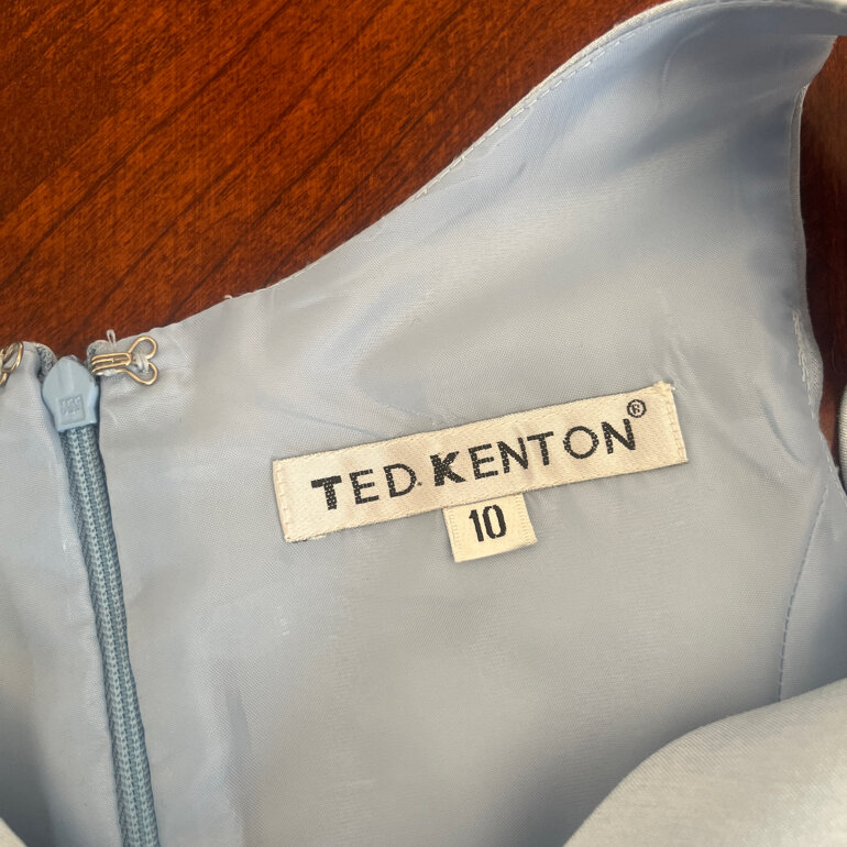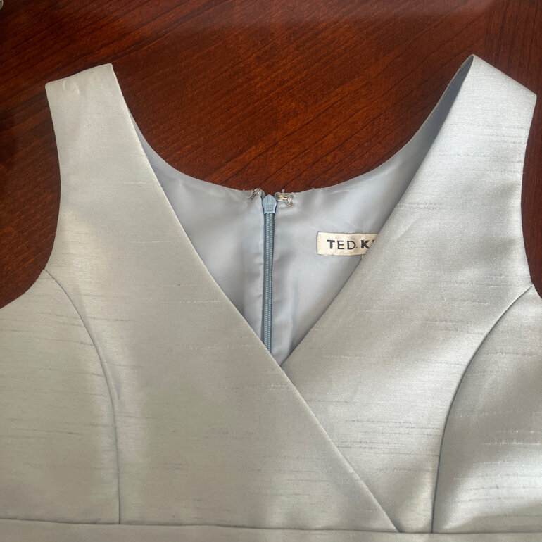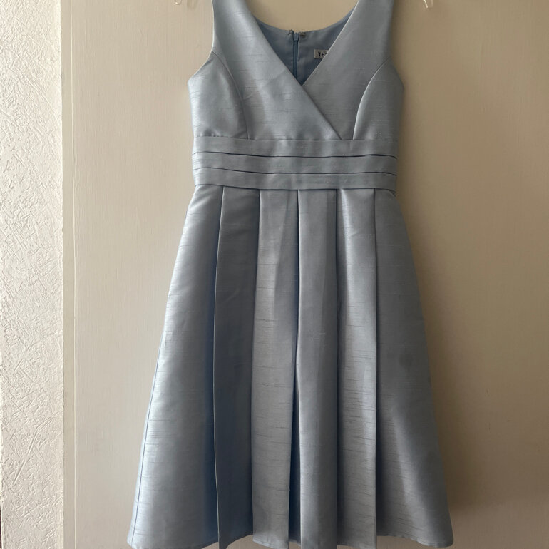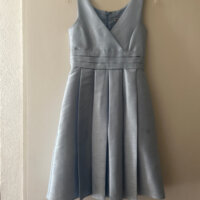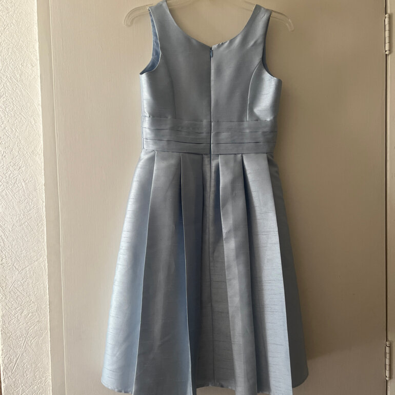 Vestido formal niña, tela shantung azul cielo, tirantes anchos, escote en v, talla 10