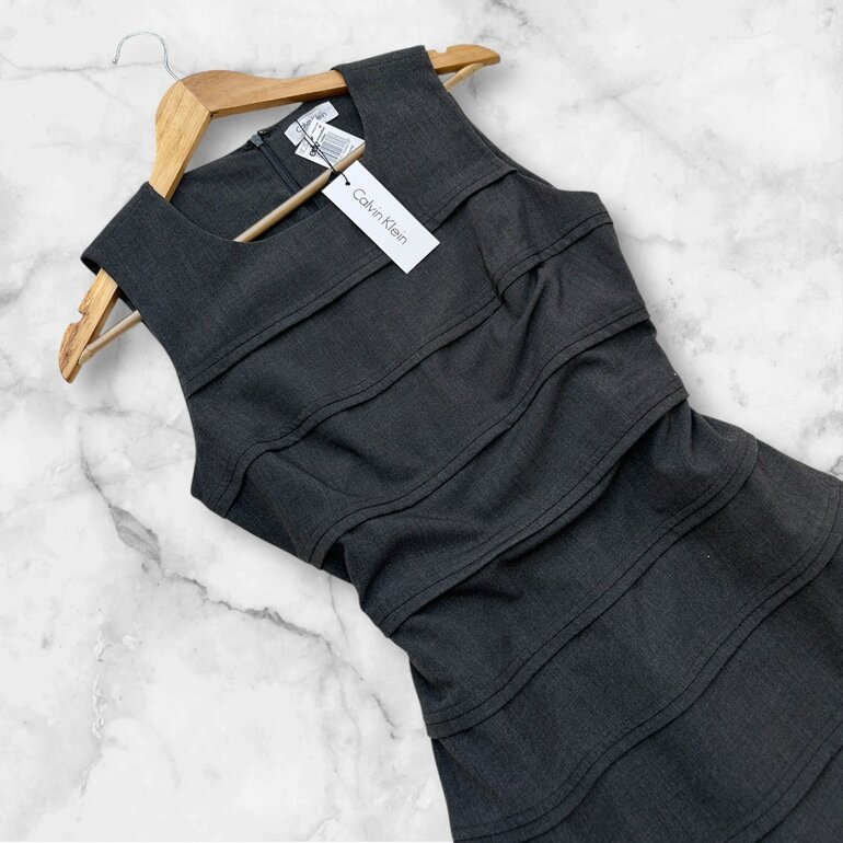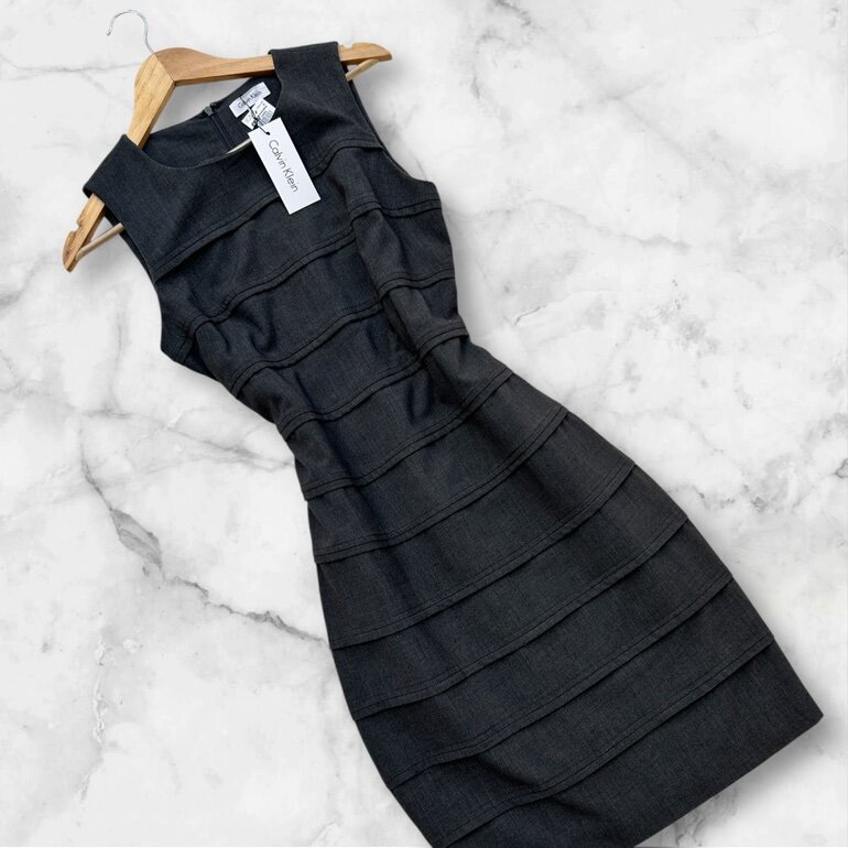 Vestido gris Calvin Klein, corte elegante y estructurado que estiliza la figura. Ideal para oficina, juntas o eventos formales. No estira