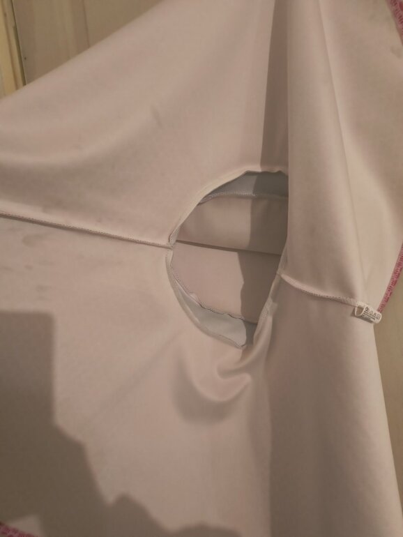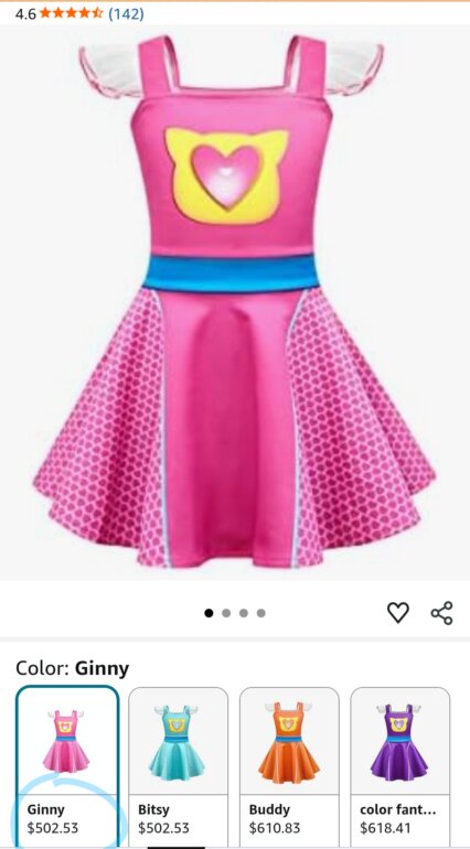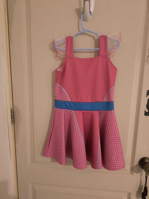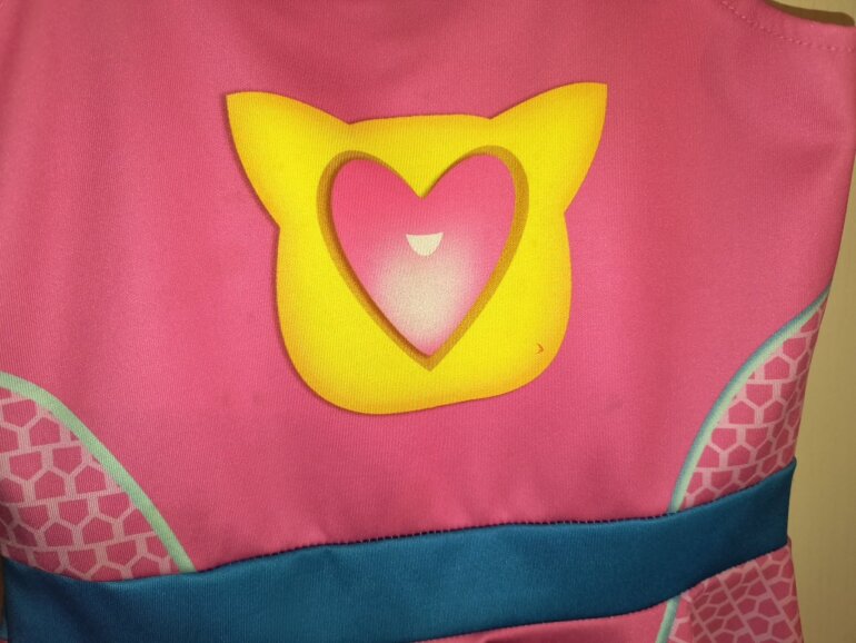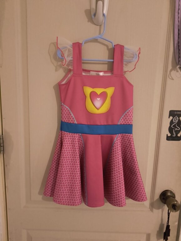 Vestido de una caricatura que se llama super kitties o supergatitos, este es la personificación de Ginny. Tiene algunas manchitas y una blanca que así desde su compra llegó. Tiene corte en A, sus holanes en las mangas. Estira pero tampoco mucho, máximo 115 cm y 16 KGS aprox.