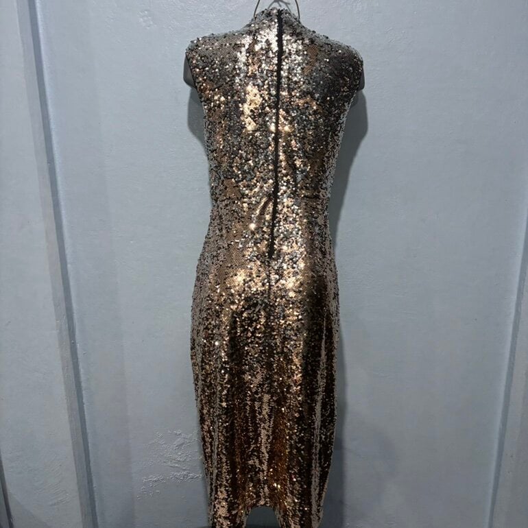 Lentejuelas doradas (100% poliéster). Reloj de arena. Sin mangas. Cuello falso. Cierre en espalda