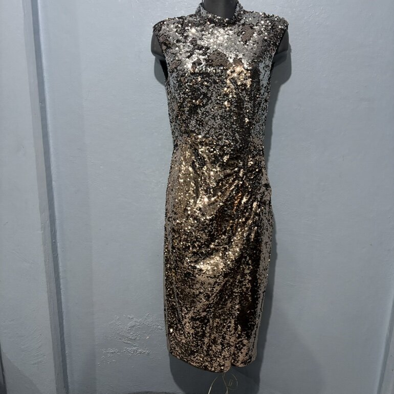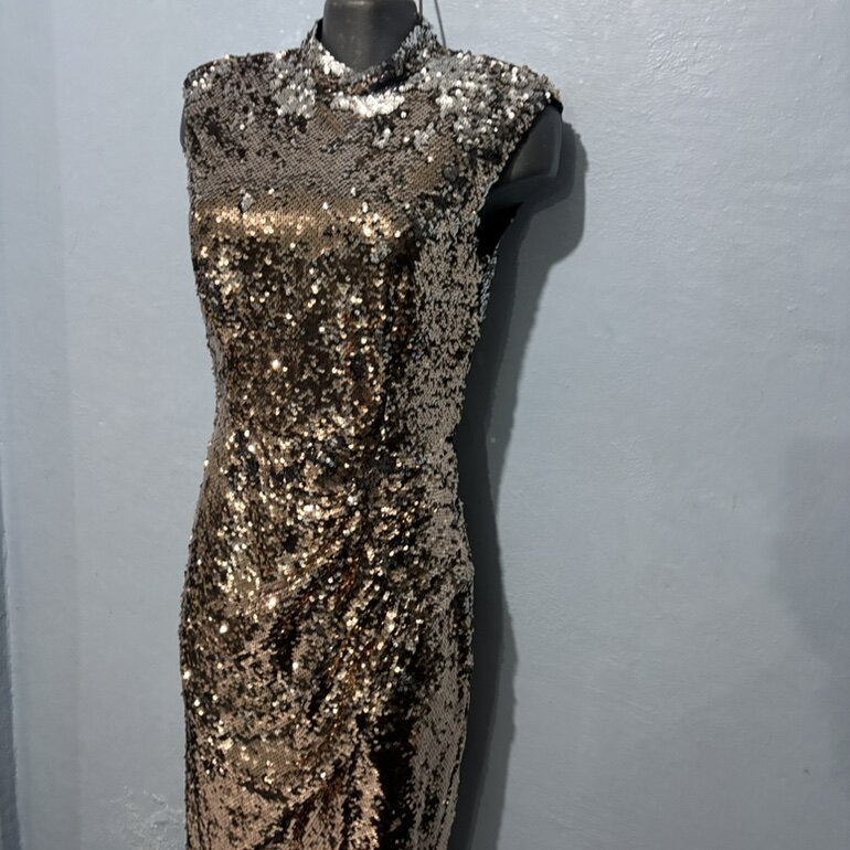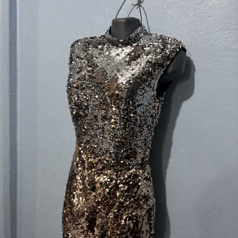 Haz que tu entrada brille con este vestido de lentejuelas doradas reversible plateada con un frunco lateral que abraza la figura.