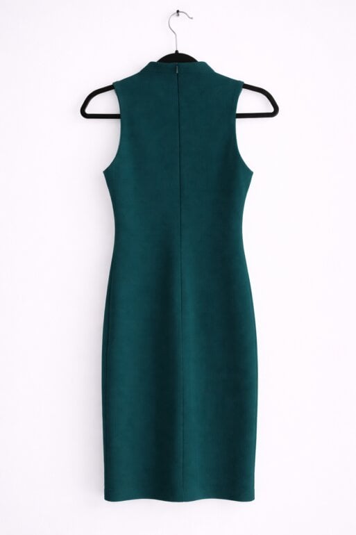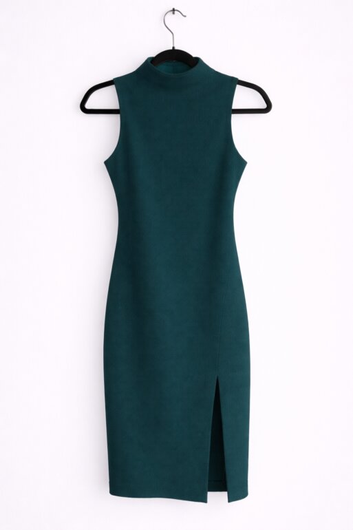 Elegante vestido midi en tono verde esmeralda, ideal para eventos, cenas o look formal con estilo minimalista. Diseño sin mangas que estiliza la figura y corte recto que realza la silueta. Cuenta con abertura lateral que aporta movimiento y un toque sofisticado.