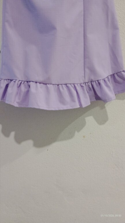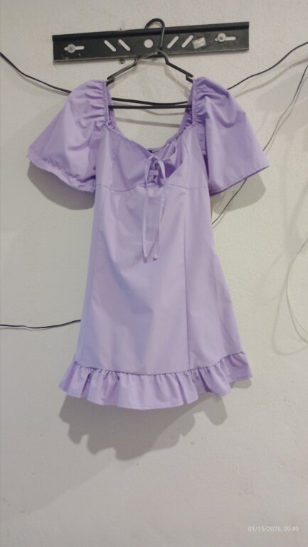 Vestido mini color lila bonito y Excelente para el dia a dia. Con olanes en el final del vestido y mangas ligermanete acampanadas. También cuenta con listones en el centro del pecho para ajustar el escote.