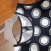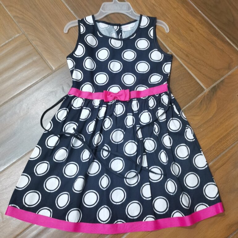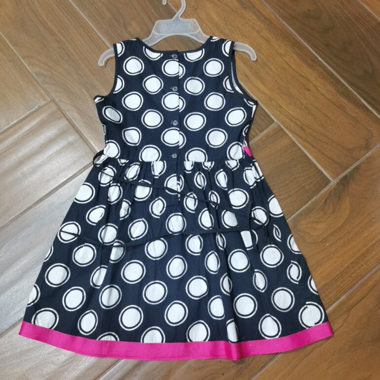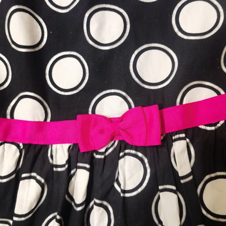 Vestido lunares, negro con blanco, con moña rosa, talla 10