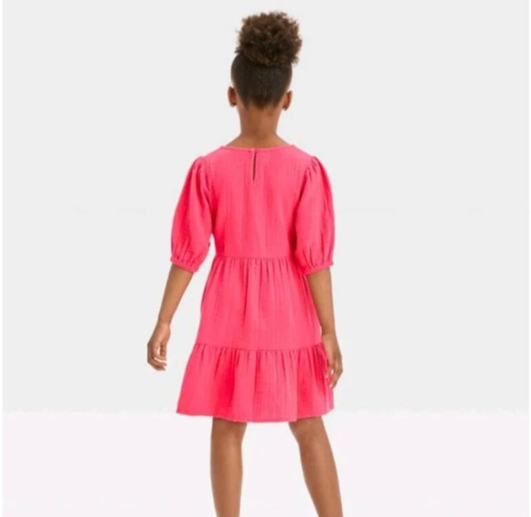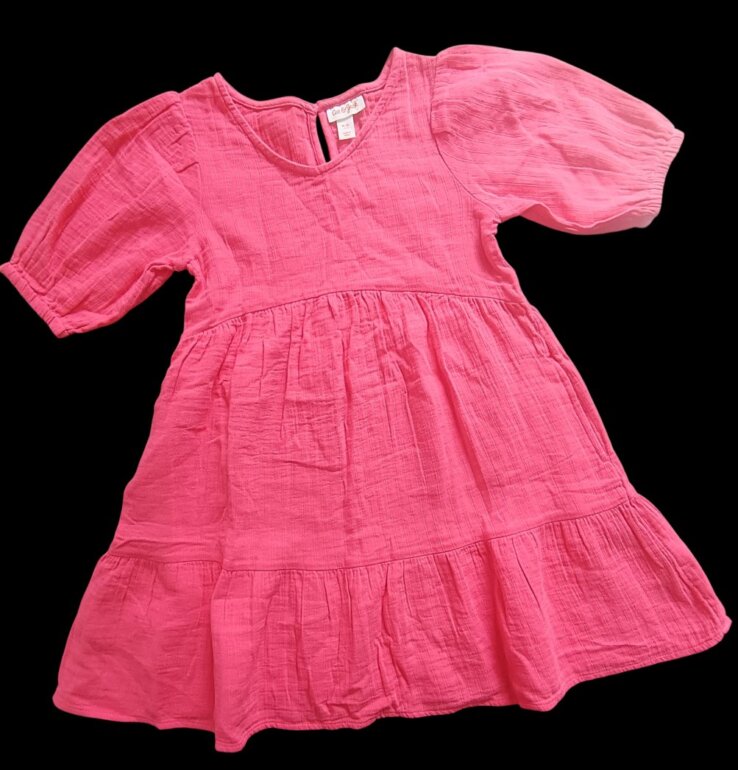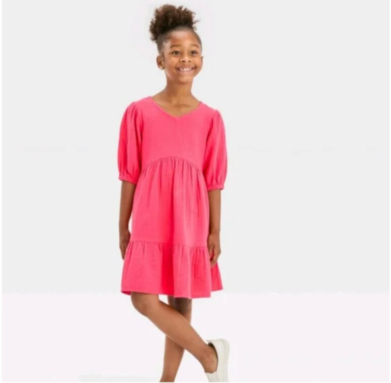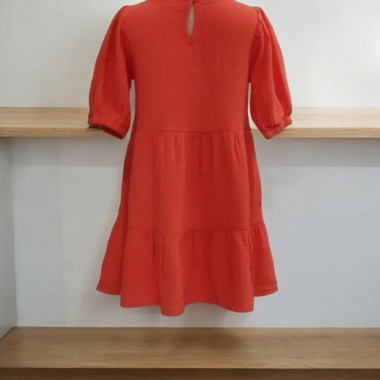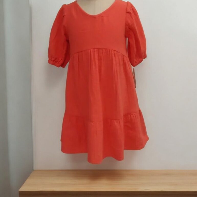 Hermoso vestido de manga corta con diseño fresco y ligero. Confeccionado en tela tipo muselina de textura suave, cuenta con falda amplia de doble vuelo y corte holgado que ofrece comodidad y movimiento. Ideal para el día a día, salidas casuales o clima cálido. Cierre en la parte trasera para un ajuste fácil y cómodo.