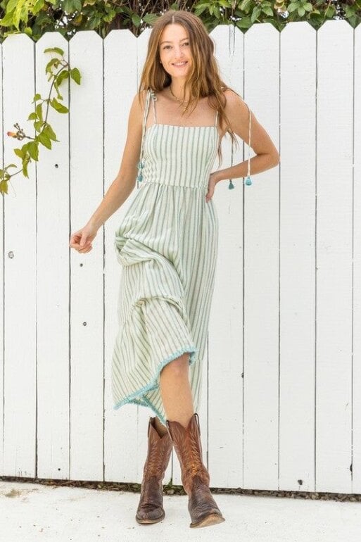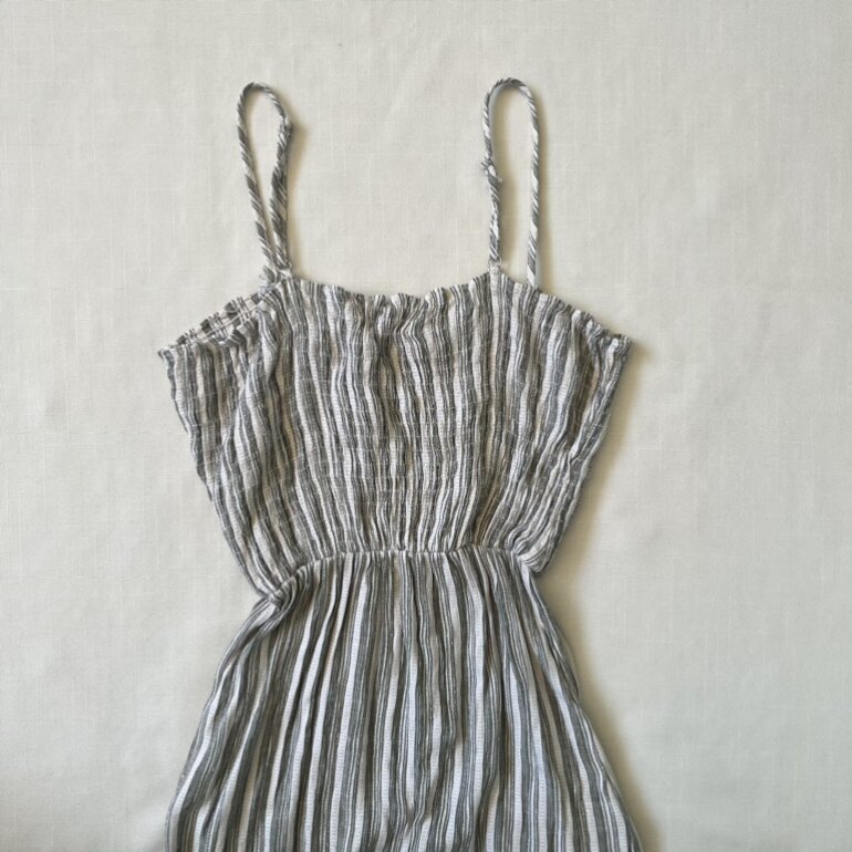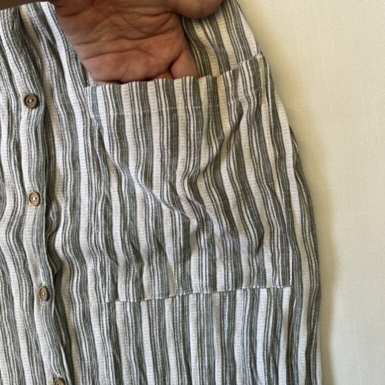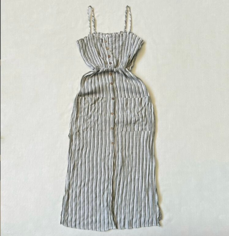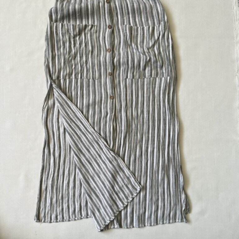 Vestido de rayas con abertura en los costado de abajo, tiene elástico en la cintura así que se ajusta al cuerpo, tiene bolsas