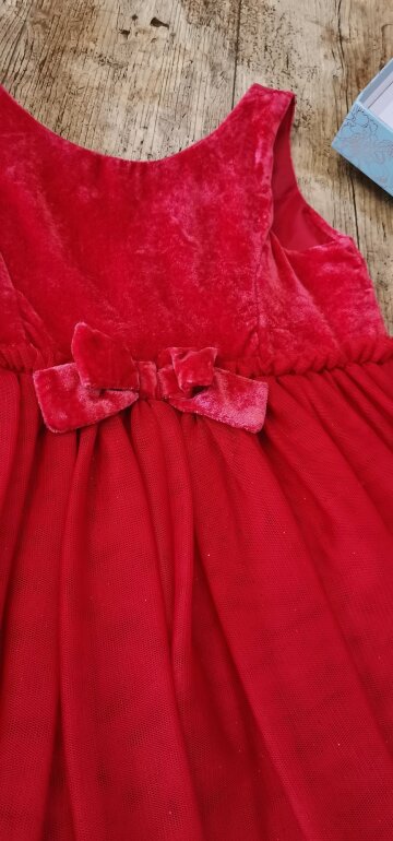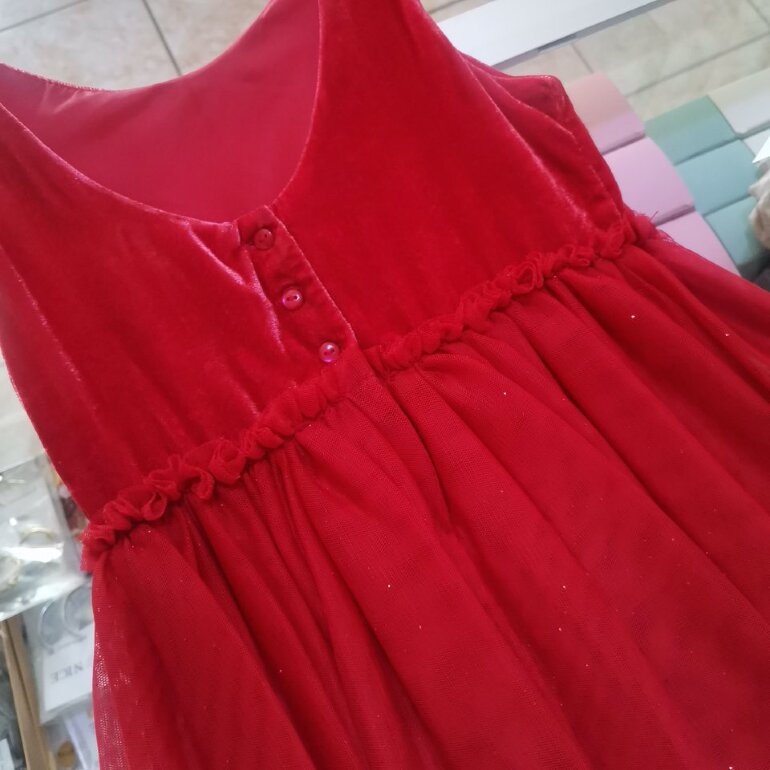 Hermoso vestido de fiesta color rojo con dos tipos de tela arriba de tipo gamusa y abajo con tul de brillitos talla 4-5 años