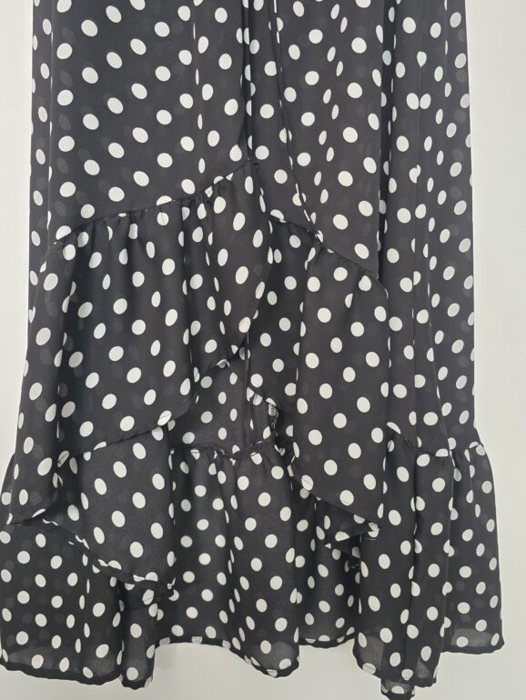 Vestido de lunares transparente, corto al frente y largo atrás.
