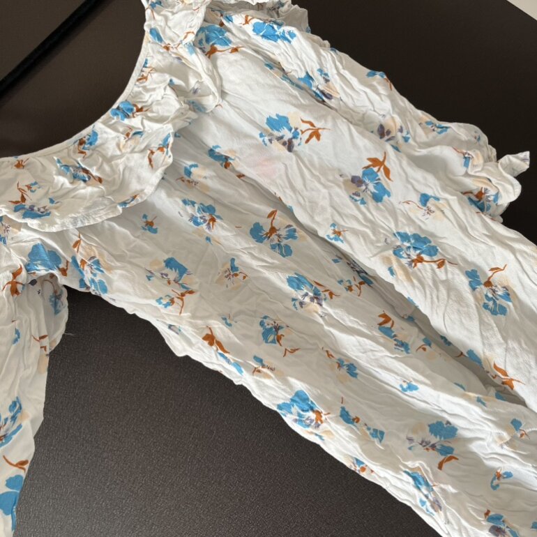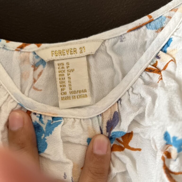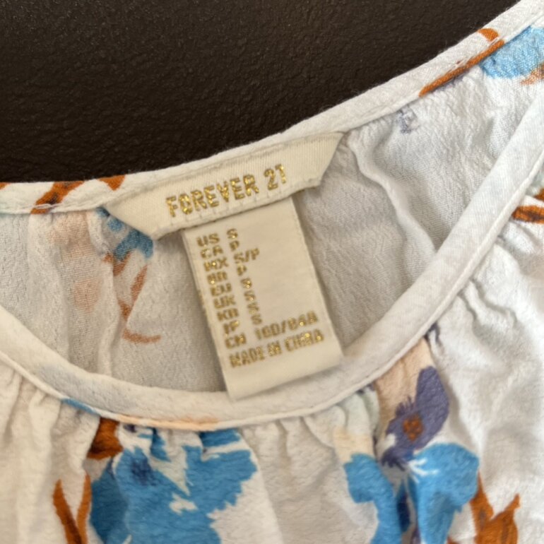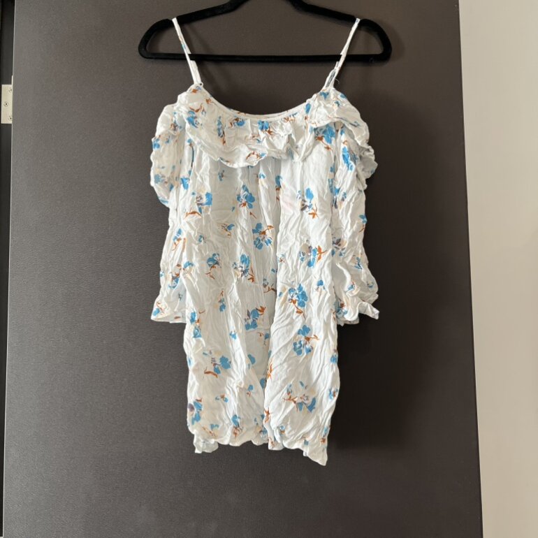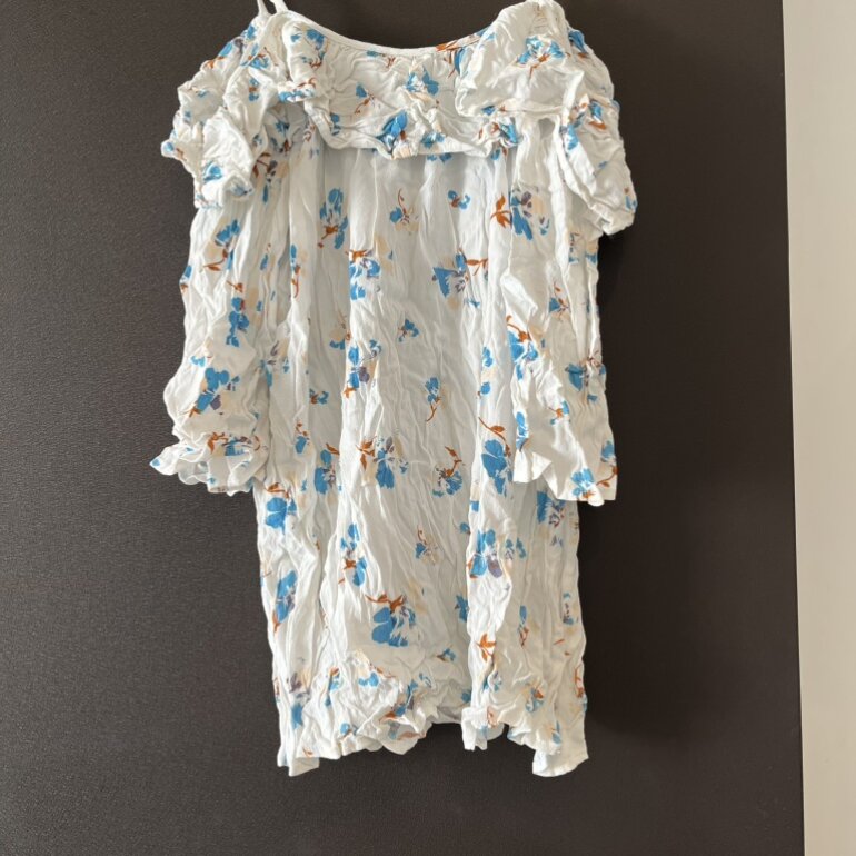 Vestido de Forever 21, talla chica (S). Confeccionada en tela ligera blanca con estampado floral en tonos azul y naranja. Diseño con vuelos en el escote y manga corta con elástico. Corte holgado, ideal para clima cálido. Está muy corto podría usarse de blusón