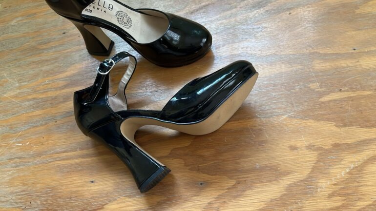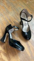 Zapatillas de charol negro, talla #23, con un estilo de tacón muy original. La compre por aqui . La talla marcada en la plantilla dice 25 pero queda a una talla 23 , para pie delgado. El tacon es # 9 , pero tiene una pequeña plataforma.