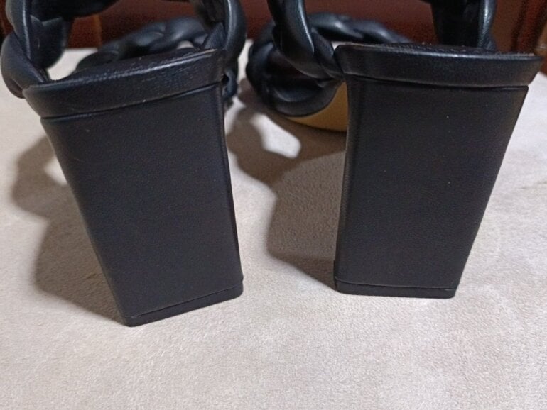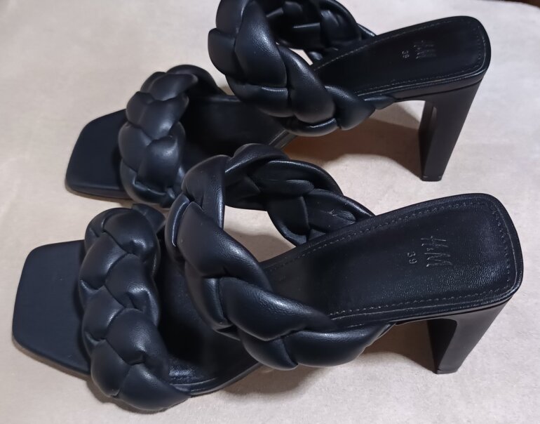 Sandalias H&M negras, talla 39 (24.5 cm), con tiras trenzadas y tacón medio ancho. Cómodas, elegantes y muy versátiles, ideales para looks casuales y formales.