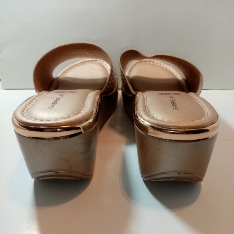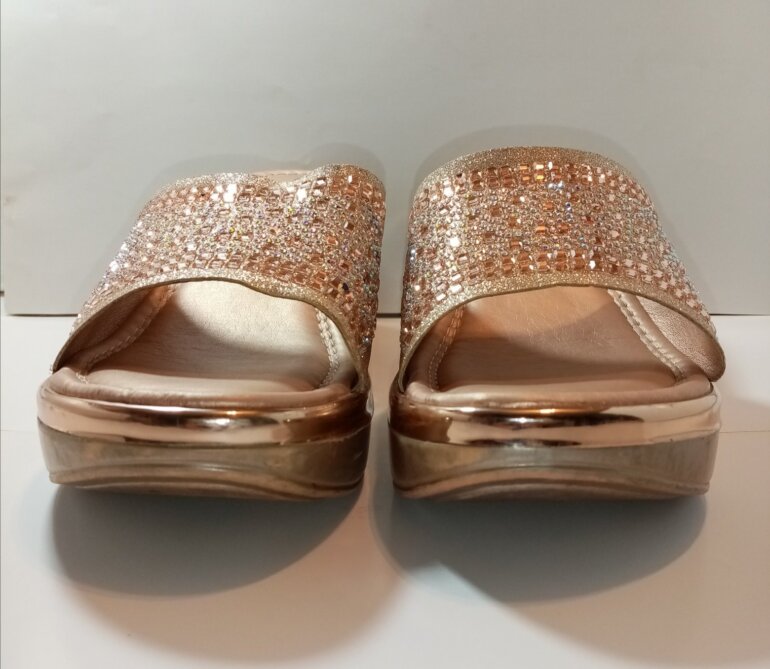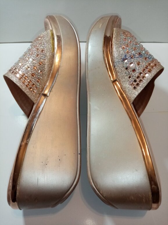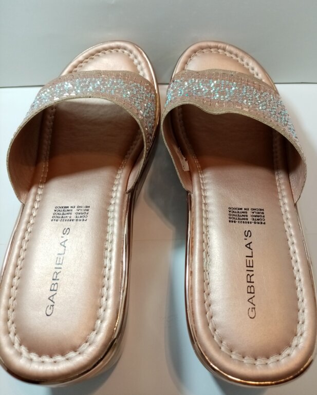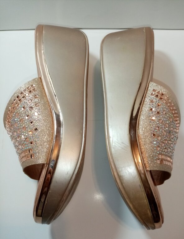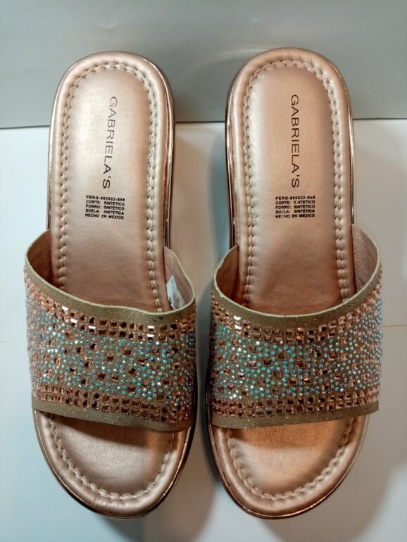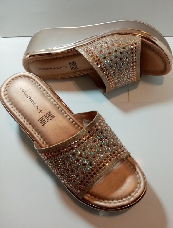 Compuestas de material sintético en su corte exterior y plantillas, y con hermosos cristales que las hacen lucir muy lindas. Traen leves marcas por uso en la parte lateral de la plataforma, la cual tiene 7 cms de altura trasera, y 3 en delantera. Son talla 25½ 🇲🇽 y quedan perfectas a la misma. P-B $ 265.00 clave 080725.